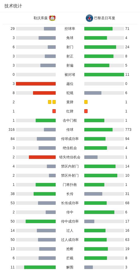 北京时间10月22日欧洲冠军联赛 联赛阶段 第3轮,勒沃库森对阵巴黎圣日耳曼。上半场,门德斯助攻帕乔头球破门,扎巴尔尼送点后格里马尔多主罚中柱,安德里希肘击杜埃被直红罚下,扎巴尔尼获红点套餐后加西亚主罚命中,KK助攻杜埃低射入网,KK抽射连续击中立柱后弹进球门,阿什拉夫助攻杜埃梅开二度;下半场,维蒂尼亚助攻门德斯破门,格里马尔多助攻加西亚梅开二度,巴尔科拉助攻登贝莱穿裆破门,维蒂尼亚远射得手同样传射建功。最终比分勒沃库森 2-7 巴黎圣日耳曼。